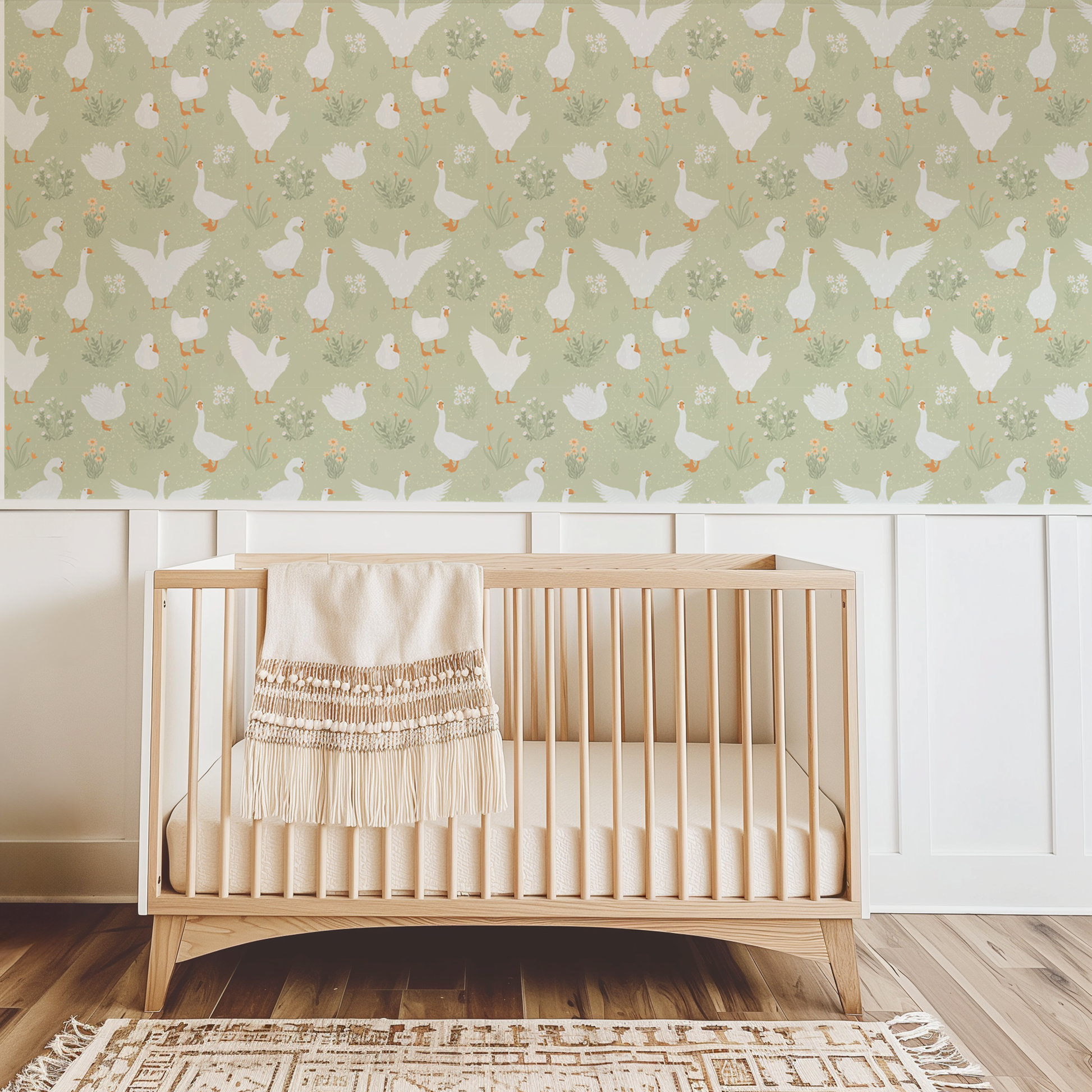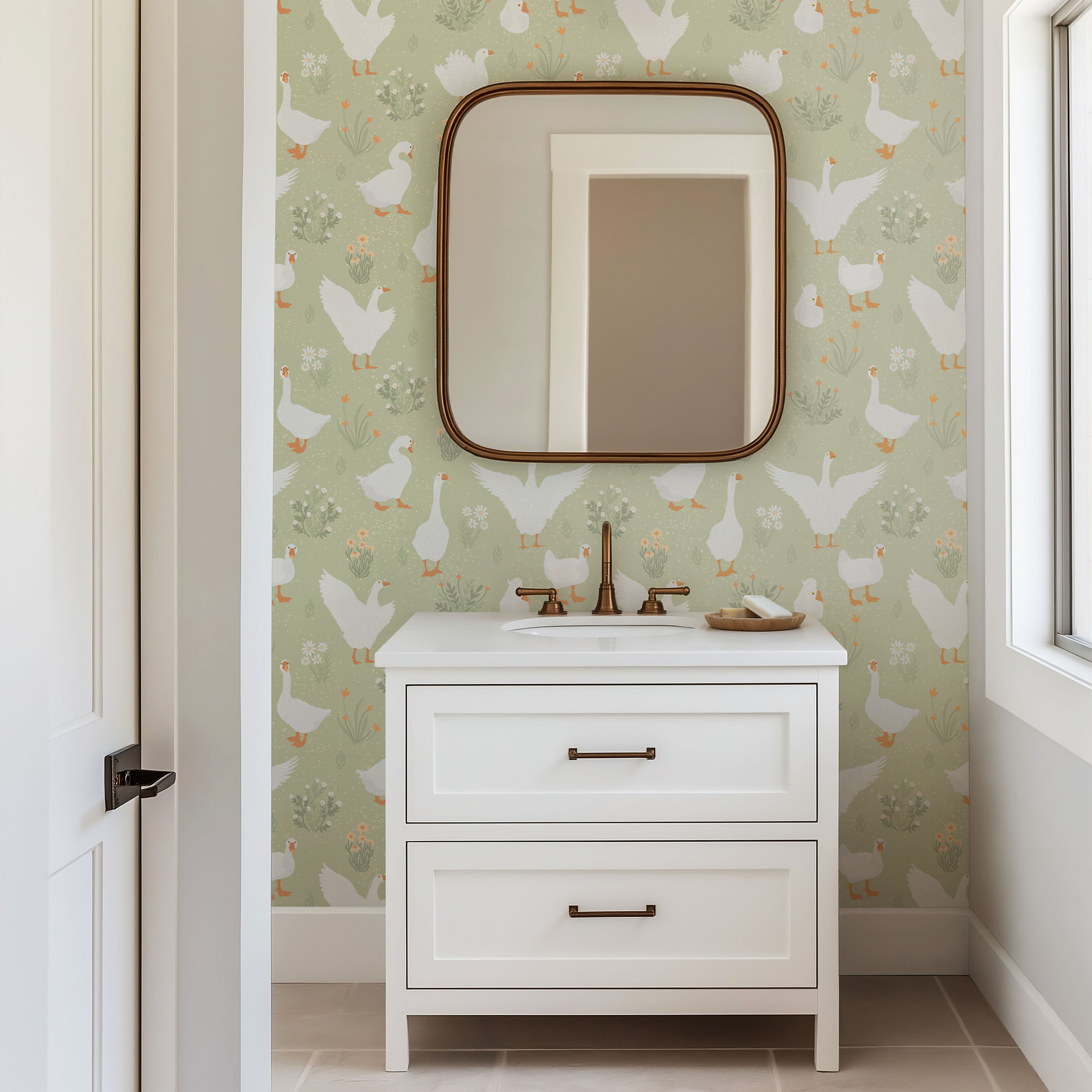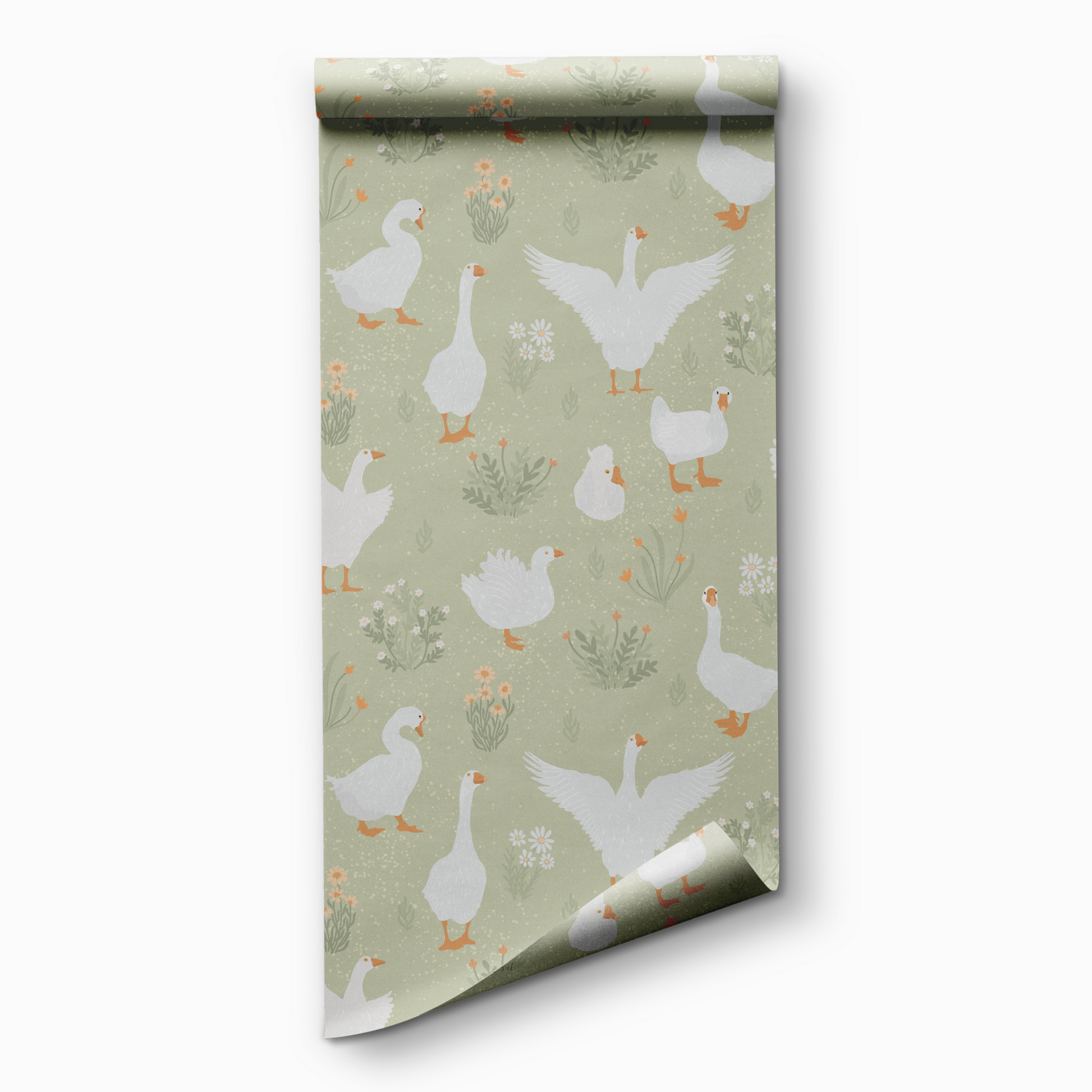 Meet the Goose Parade — a playful pattern of geese and garden blooms that feels straight out of a storybook meadow. Soft sage tones and friendly feathered friends make this wallpaper perfect for adding personality and charm to any room, from cozy cottages to modern spaces that need a little whimsy.