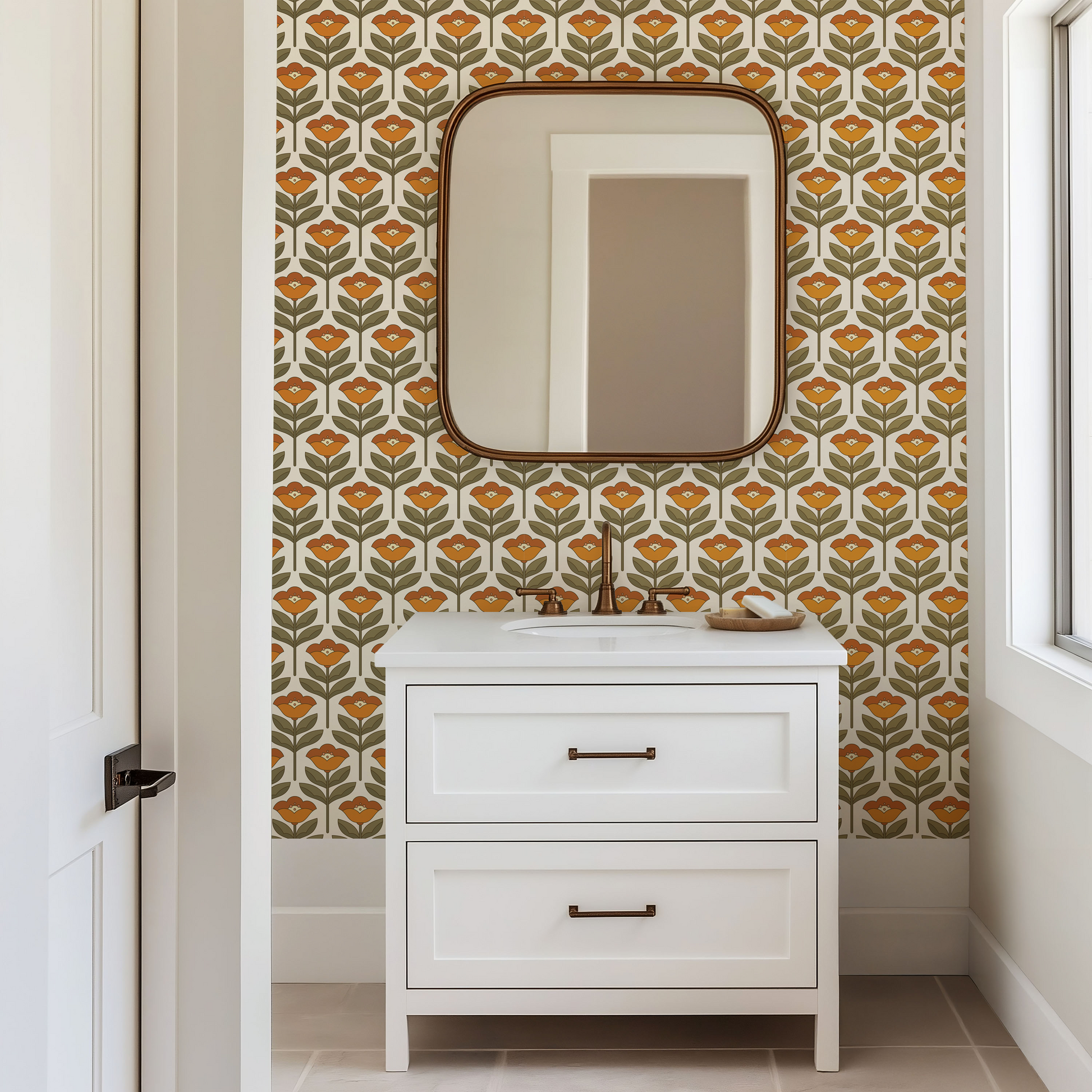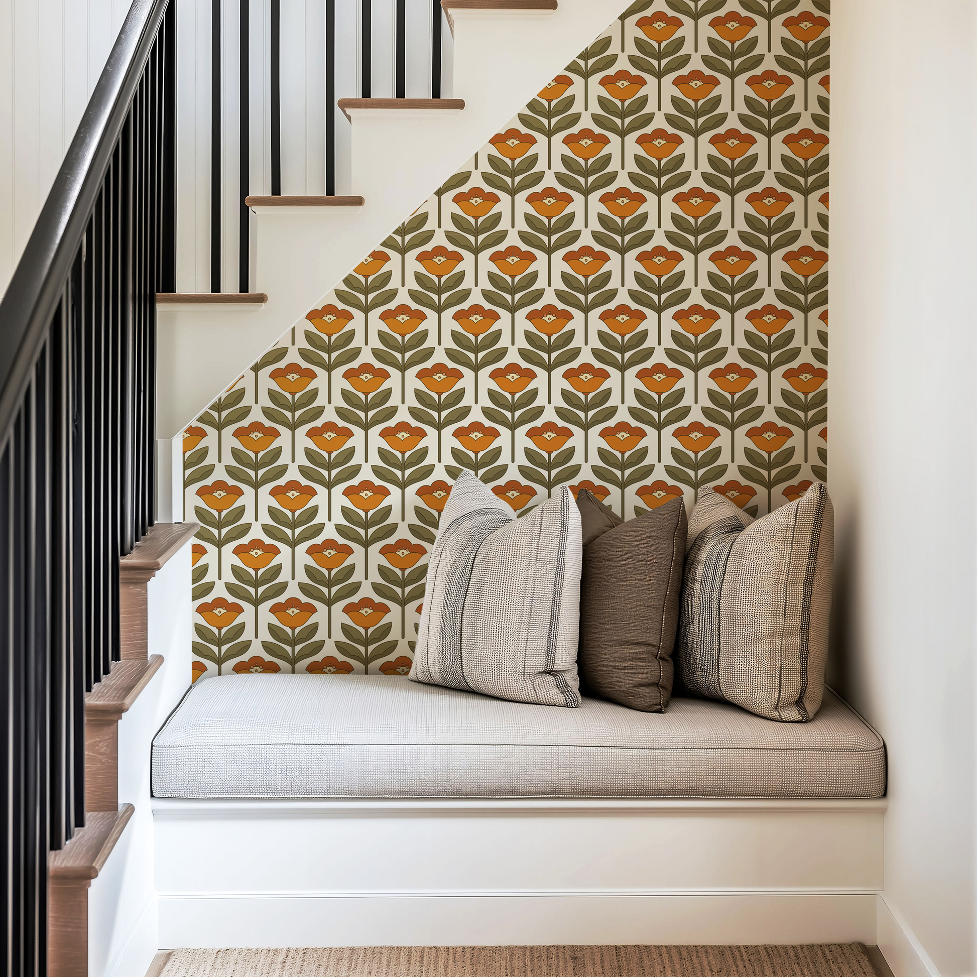 Our Garden Bloom wallpaper is bright, warm, and endlessly inviting. With bold retro florals in warm golden and olive tones, it’s a happy nod to vintage design — perfect for kitchens, bedrooms, or anywhere that needs a little glow-up.